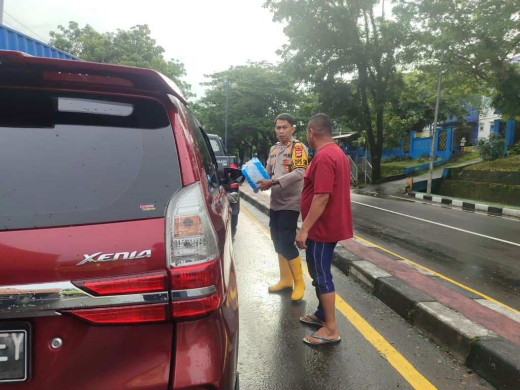 Selain melakukan evakuasi, petugas Kepolisian juga membagikan air minum kepada pengendara yang terjebak macet.