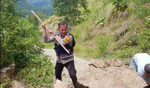 Longsoran tanah dan bebatuan yang terjadi sebelumnya mengakibatkan akses jalan tidak dapat dilalui kendaraan roda dua maupun roda empat. Menyikapi hal tersebut, Bhabinkamtibmas segera berkoordinasi dengan pemerintah setempat serta masyarakat sekitar untuk melaksanakan kerja bakti membersihkan material menggunakan peralatan seadanya.