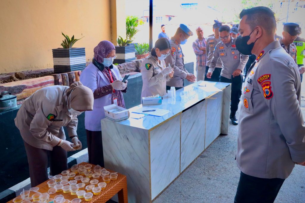 “Hari ini kita lakukan pemeriksaan urine kepada sejumlah personel secara dadakan. Ada total 165 personel yang menjalani tes urine, dan Alhamdulillah secara keseluruhan hasilnya negatif sebagai pengguna narkoba,” terang Kapolres.