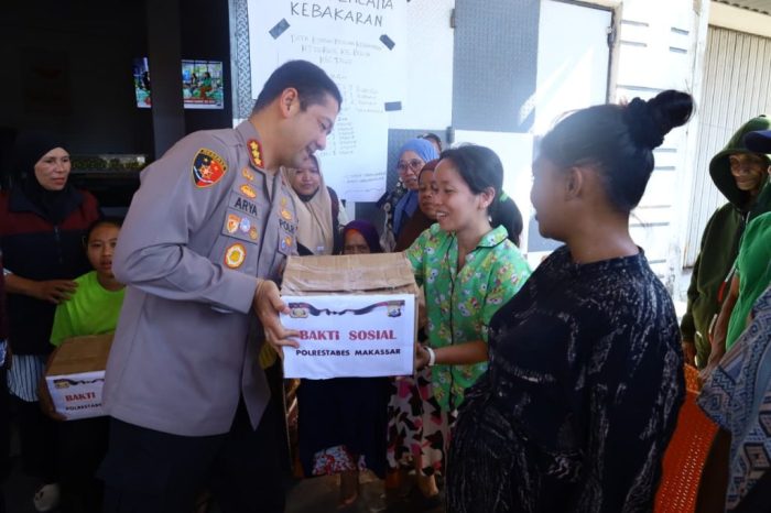 MAKASSAR – Kapolrestabes Makassar Kombes Pol Arya Perdana, SH, SIK,M.Si, bersama PJU menyalurkan bantuan sosial kepada korban kebakaran yang terjadi di Jalan Sultan Abdullah Raya RT 02/RW 06 Kelurahan Buloa Kecamatan Tallo Kota Makassar. Rabu (20/08/2025).
