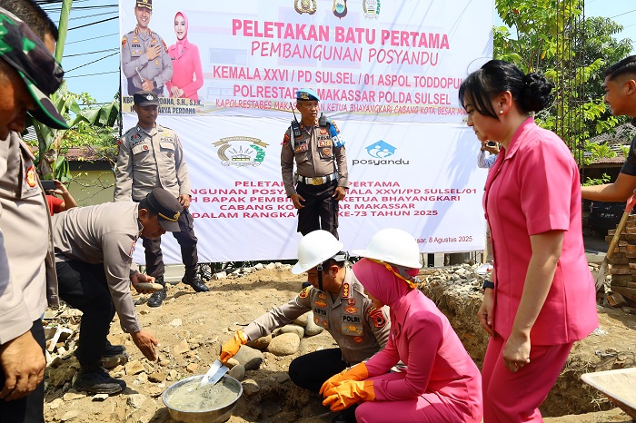 MAKASSAR – Kapolrestabes Makassar Kombes Pol Arya Perdana, SH,SIK,M.Si didampingi oleh Ketua Bhayangkari Cabang Tabes Makassar Ny. Emma Arya Perdana melakukan peletakakan batu pertama pembangunan Posyandu Kemala di Aspol Toddopuli Kelurahan Kassi Kassi Kota Makassar, Jumat (08/08/2025).
