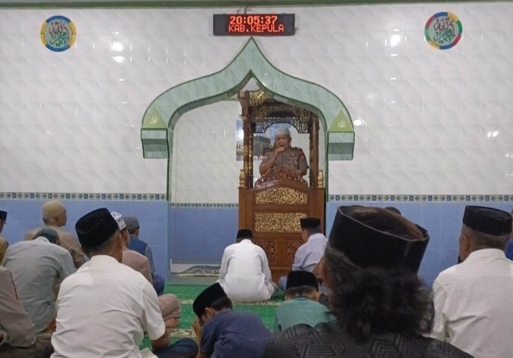 KEP. SELAYAR-Kasat Binmas Polres Kepulauan Selayar IPTU Jajang Solehuddin membawakan ceramah dan pesan kamtibmas dalam kegiatan Tarawih Keliling di Masjid Baburrahim, Jalan Veteran, Kelurahan Benteng Utara, Kecamatan Benteng, Kabupaten Kepulauan Selayar, Minggu malam (01/03/2026).