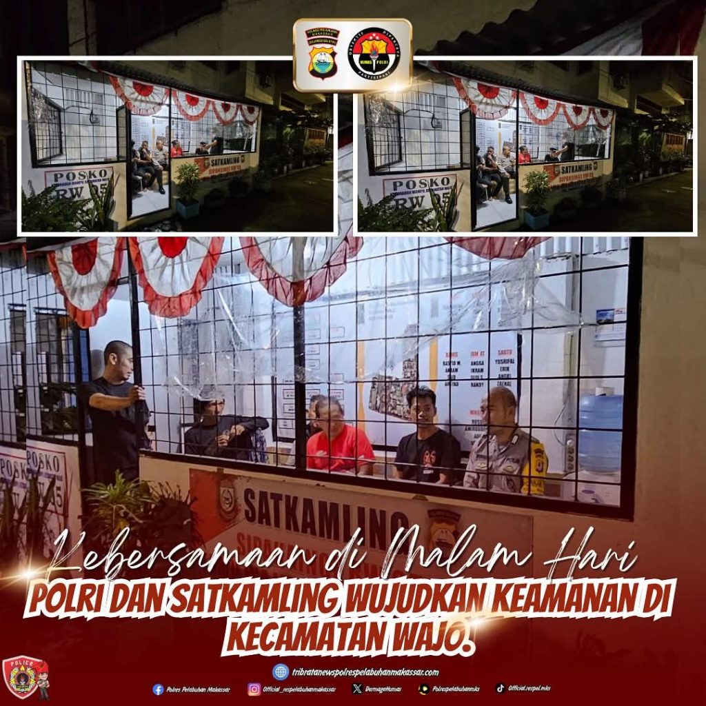 Bhabinkamtibmas bersama personel Satkamling RW 05 Kelurahan Mampu, Kecamatan Wajo, Makassar, menunjukkan kekompakan dengan melaksanakan ronda bersama. Kegiatan ini menjadi bukti nyata sinergi antara Polri dan masyarakat dalam menjaga kamtibmas di wilayah hukum Polres Pelabuhan Makassar.
