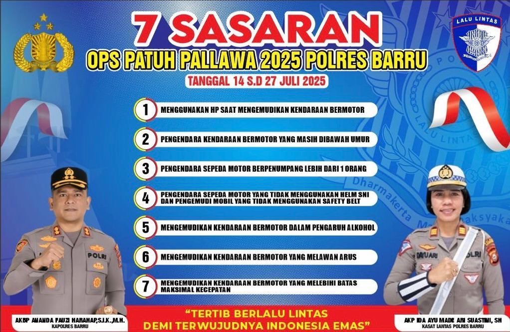 BARRU – Untuk meningkatkan kepatuhan masyarakat terhadap peraturan lalu lintas serta menekan angka kecelakaan dan pelanggaran di jalan raya, Polres Barru Mulai hari akan menggelar Operasi Patuh Pallawa dengan sejumlah sasaran prioritas yang menjadi fokus utama.