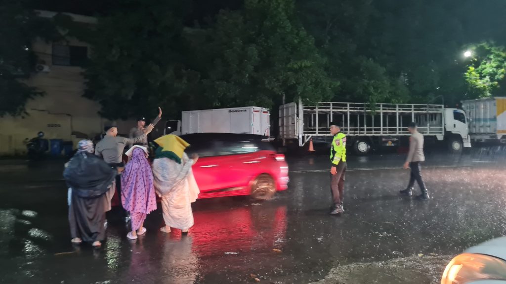 Seperti yang dilakukan di area mesjid agung Ar Rahman Maros, Tampak beberapa personel Polri melakukan pengaturan lalulintas, membantu warga menyeberang jalan ditengah kondisi hujan