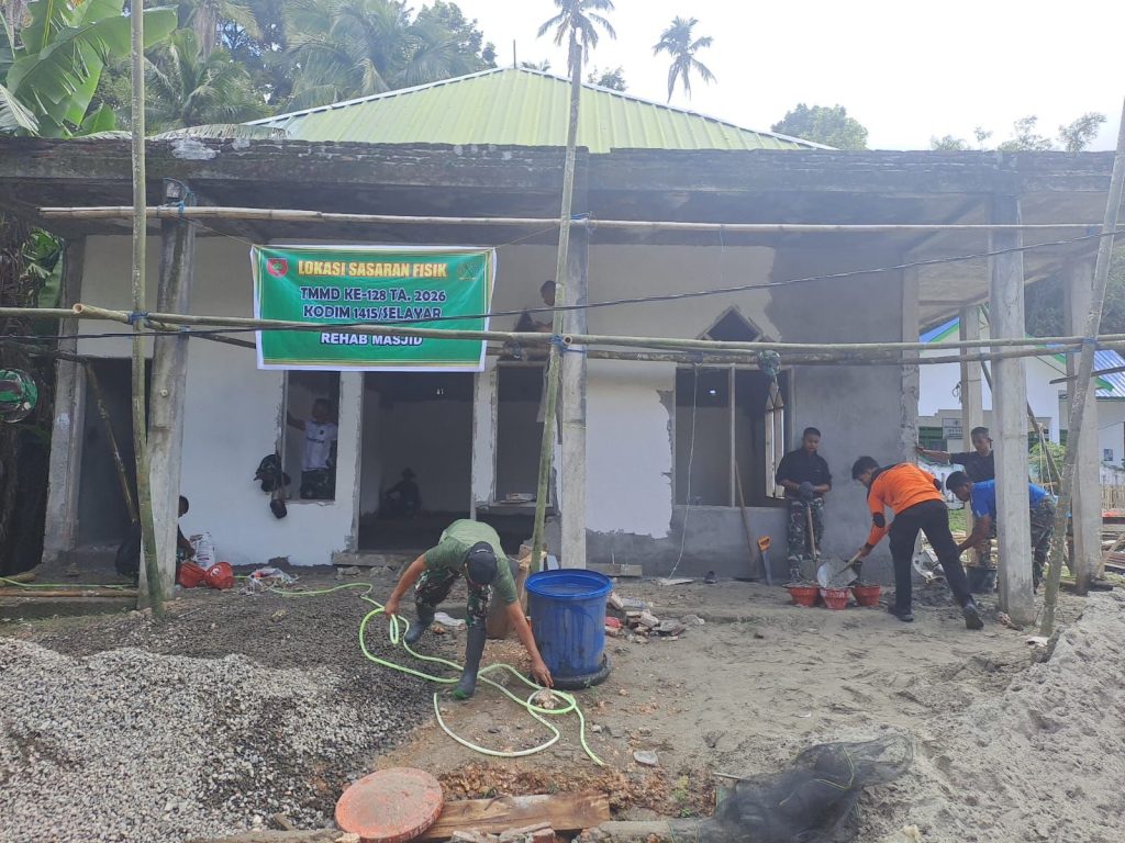 KEPULAUAN SELAYAR-Sinergi antara TNI dan Polri kembali terlihat dalam pelaksanaan program TNI Manunggal Membangun Desa (TMMD) ke-128 Kodim 1415/Selayar, melalui kegiatan rehabilitasi masjid dan rumah tidak layak huni (RTLH) yang dilaksanakan di Lingkungan Sukadin, Kelurahan Batangmata Sapo, Kecamatan Bontomatene, Kabupaten Kepulauan Selayar, Jumat (24/4/2026).